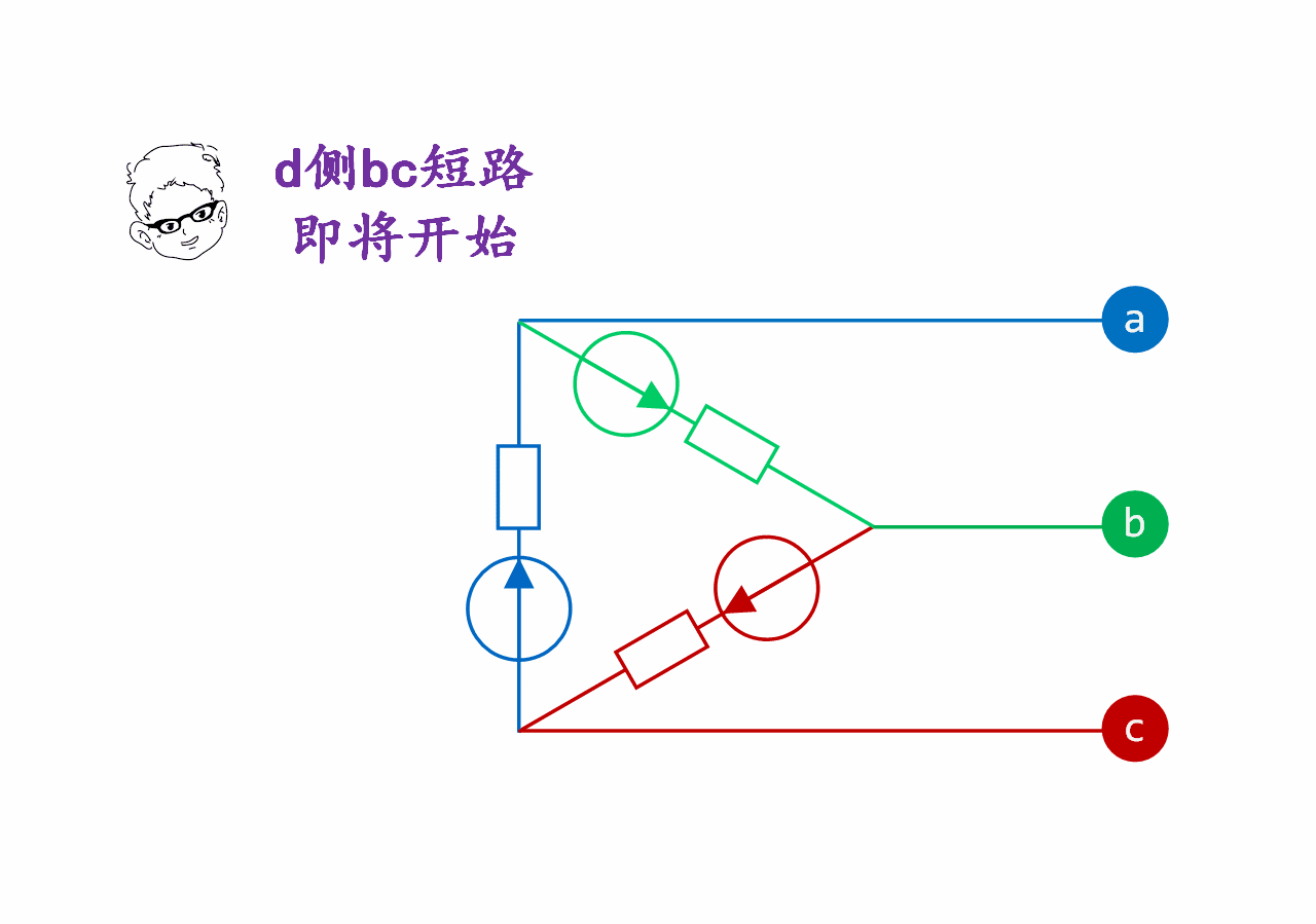 先分析三角連接的xyz電源發(fā)生bc短路:因a相沒有短路,故Ia為零,x繞組(藍色)和y繞組(綠色)電源串聯(lián),等效電勢為-(Ex + Ey) = Ez,等效阻抗為2倍系統(tǒng)阻抗,故z繞組(紅色)電源提供的短路電流是xy串聯(lián)繞組電流的2倍,如下面動態(tài)圖所示(時長15秒):