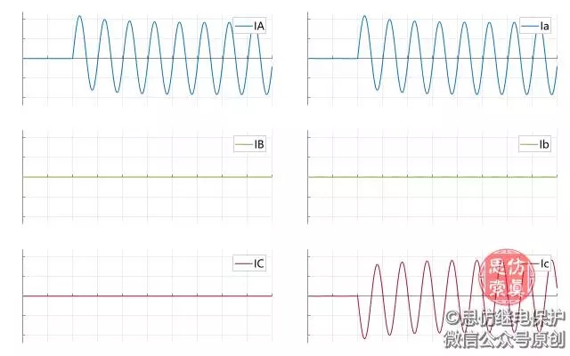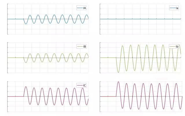 電源在d側,Y側中性點接地,當A相接地時,X繞組—中性點—A相接地點形成回路,有短路電流,而Y、Z繞組無短路電流。繪制出d側繞組電流和abc相電流,如下面動態(tài)圖所示: