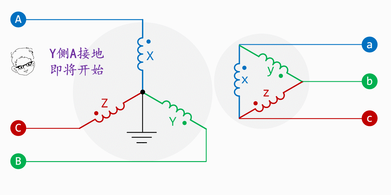 Y/d-11變壓器的繞組連接如下圖所示: