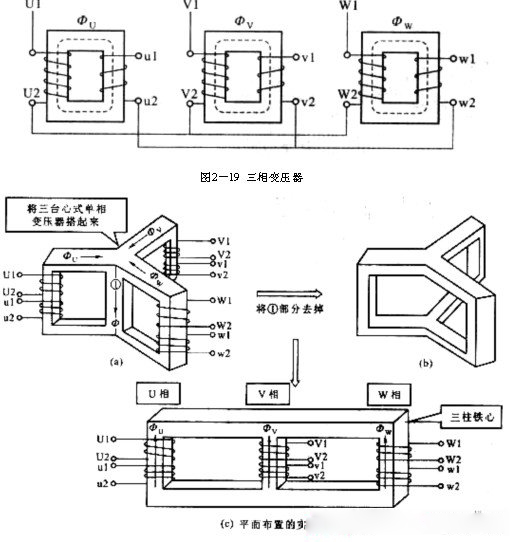 現(xiàn)代的電力系統(tǒng)都采用三相制供電,因而廣泛采用三相變壓器來實(shí)現(xiàn)電壓的轉(zhuǎn)換。三相變壓器可以由三臺(tái)同容量的單相變壓器組成,再按需要將一次繞組及二次繞組分別接成星形或三甬形聯(lián)結(jié)。圖2—19所示為一、二次繞組均用星形聯(lián)結(jié)的三相變壓器組。三相變壓器的另一種結(jié)構(gòu)型式是把三個(gè)單相變壓器合成一個(gè)三鐵心柱的結(jié)構(gòu)型式,稱為三相心式變壓器,如圖2—20(a)所示。由于三相繞組接入對(duì)稱的三相交流電源時(shí),三相繞組中產(chǎn)生的主磁通也是對(duì)稱的,故三相磁通之和等于零,即中間鐵心柱的磁通為零,因此中間鐵心柱可以省略,成為(b)圖形式,實(shí)際中為了簡化變壓器鐵心的剪裁及疊裝工藝,均采用將U、V、W三個(gè)鐵心柱置于同一個(gè)平面上的結(jié)構(gòu)型式,如圖2—20(c)所示。