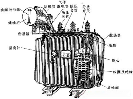在三相電力變壓器中,目前使用最廣的是油浸式電力變壓器,它主要由鐵心、繞組、油箱和冷卻裝置、保護(hù)裝置等部件組成,其外形如圖2—21所示,現(xiàn)簡介如下: