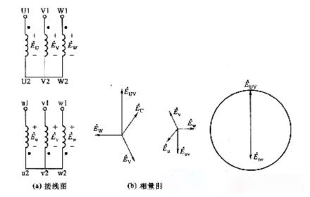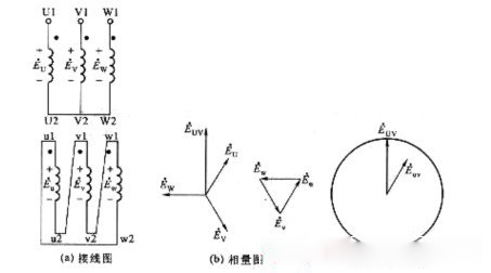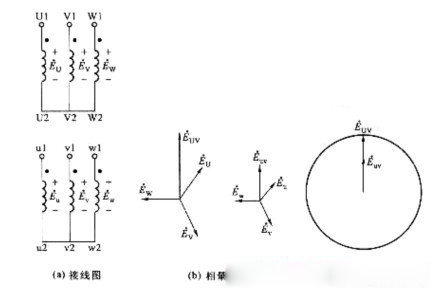 如圖2—31所示,變壓器一次繞組用星形聯(lián)結(jié),二次繞組用三角形聯(lián)結(jié),且二次繞組u相的首端u1與v相的末端v2相連,即如圖2—31(a)所示的逆序連接,如一、二次繞組的首端為同名端,則對(duì)應(yīng)的相量圖如圖2—31(b)所示。如圖2—31(c)所示。