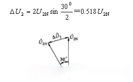如果兩臺(tái)變壓器的變比和短路阻抗均相等,但是聯(lián)結(jié)組別不同時(shí)并聯(lián)運(yùn)行,則其后果十分嚴(yán)重。因?yàn)槁?lián)結(jié)組別不同時(shí),兩臺(tái)變壓器二次繞組電壓的相位差就不同,它們線電壓的相位差至少為30o,因此會(huì)產(chǎn)生很大的電壓差ΔU2。圖2-34為Y,y0和Y,dll兩臺(tái)變壓器并聯(lián),二次繞組線電壓之間的電壓差ΔU2。其數(shù)值為