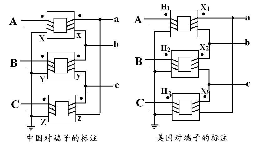 另外,在美國課本的接線端子標(biāo)志中,把高壓側(cè)的端子上都加“H”(High),因?yàn)榕袆e聯(lián)結(jié)組的組別時(shí),是以高壓端為基準(zhǔn)的。