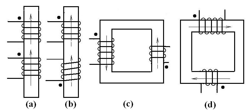 圖中畫的是變壓器的部分鐵芯和纏繞在鐵芯上的繞組,黑點(diǎn)是極性標(biāo)志。有四種情況。圖(a)是把繞制方向相同的兩個(gè)繞組的始端作了標(biāo)記(黑點(diǎn));圖(b)的兩個(gè)繞組的總體繞向雖然是相反的,但是,從上面繞組的始端和下面繞組的末端看,繞組的繞向還是相同的,因此,它們也是同名端。