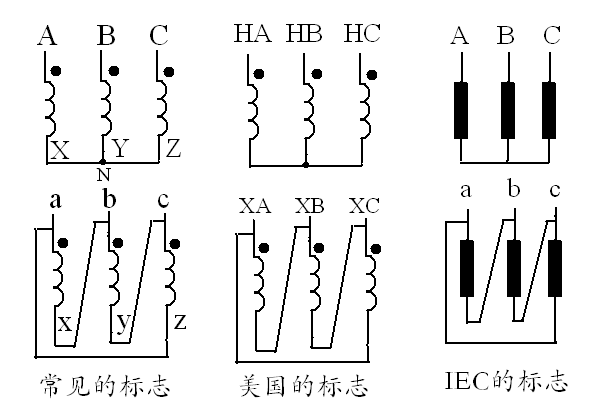 通常把跟線路端子連接的繞組那端稱為首端(或始端),在我國,線路端子的符號就是繞組的首端符號。也就是說,首端沒有專門的符號。把同一個(gè)繞組的另一端稱為尾端(或末端),高壓繞組的尾端通常用大寫的X、Y、Z表示;低壓繞組的尾端通常用小寫的x、y、z表示。見圖1,這是我國的標(biāo)記方法。