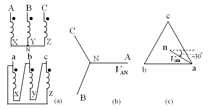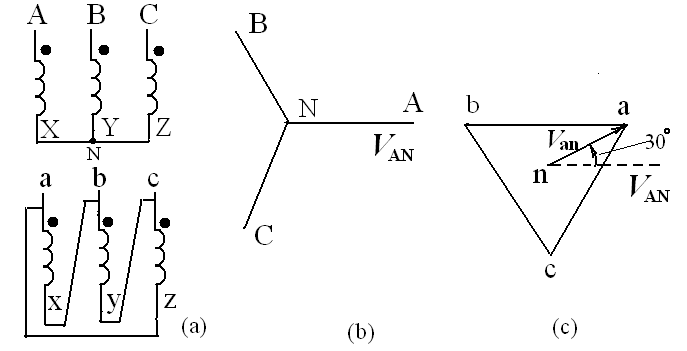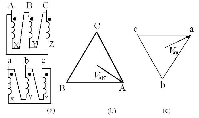 答:對Y-Y結(jié)線的分析比較簡單。例如對下圖的變壓器結(jié)線圖來說,首先要畫出高壓側(cè)的相量圖(見圖b),然后再畫低壓側(cè)的相量(見圖c)。畫低壓側(cè)相量的關(guān)鍵是把的相量畫得跟相一致。因?yàn),在這里,它們兩個(gè)繞組是繞在同一個(gè)鐵芯柱上的。
