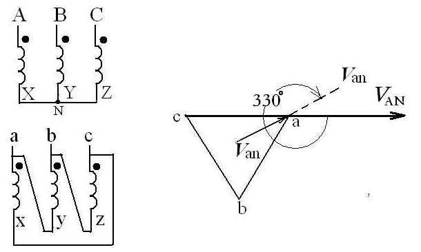圖18 Yd5形結(jié)線的三相變壓器相量圖和結(jié)線圖