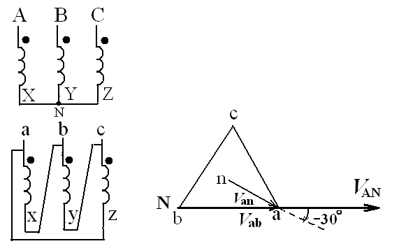 圖12 Yy形結(jié)線的相量圖