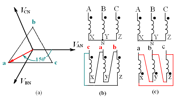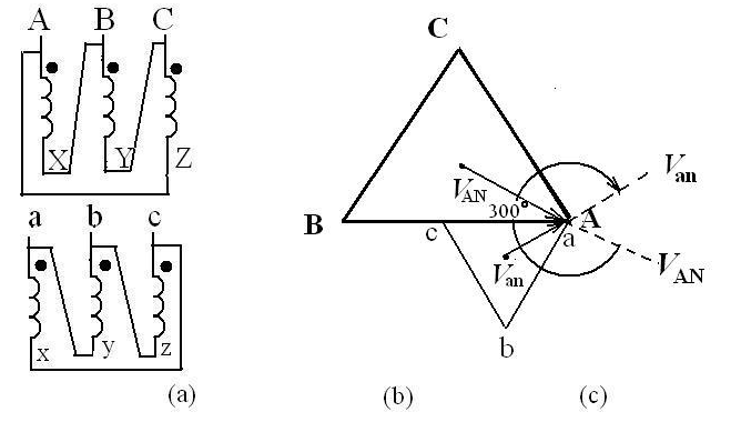 圖(b)是高壓側(cè)的正序相量圖。電壓是假想的相電壓。圖(c)是低壓側(cè)的相量圖。為什么三角形要倒立著畫?這是因?yàn)楦邏簜?cè)的電壓是,跟它繞在同一鐵芯柱上的低壓是,畫相量圖時(shí),二者必須是同相的。除了要滿足這個(gè)要求之外,還必須滿足低壓相量也是正序的要求,因此,低壓側(cè)的相量只好倒立了。