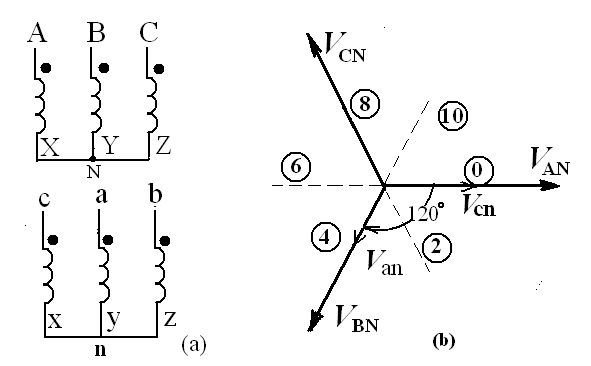 當(dāng)前,國內(nèi)書刊介紹的判別三相變壓器的聯(lián)結(jié)組別的方法有多種,基本上都是按線電壓來判別的。可是,國際標(biāo)準(zhǔn)(我國已全面采用作為國家標(biāo)準(zhǔn))中明確規(guī)定用相電壓進(jìn)行判斷,在IEC標(biāo)準(zhǔn)中給出了相量示意圖,但是并沒有作解釋。在美國的大學(xué)課本中(見文獻(xiàn)1)介紹了相量圖的畫法和結(jié)線組別的分析方法。本文就是介紹這種方法的。在學(xué)習(xí)介紹過程中,作者也提出了更簡化的分析判定方法。
