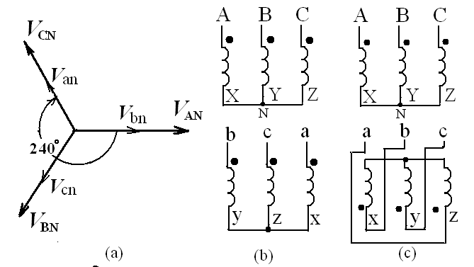 同相。根據(jù)這種相量關(guān)系和變壓器的極性標(biāo)記就可以繪制出結(jié)線圖了。圖(b)是“減極性”畫法;圖(c)是“加極性”畫法。