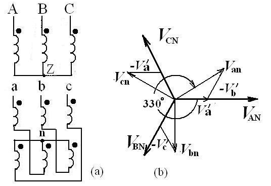 從相量圖分析,跟高壓A相同相的電壓是。另外在這個(gè)基礎(chǔ)上還有,合成低壓是。跟的相位差是330度。因此,這種聯(lián)結(jié)方法的標(biāo)號屬于Yz11。這樣結(jié)線的好處是可以降低零序電流的影響。